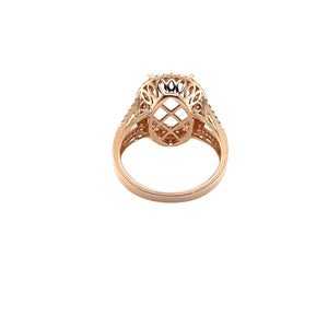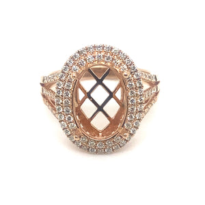 Brilliant Accent Diamonds Sparkles In This Elegant, One Of A Kind Double Halo With A 3 Row Split Shank Micro Pave Diamond Semi-Mount Ring. Crafted In 14K Rose Gold For A Total Of 1.00 Carats Of Near Colorless Round Diamonds With Vs Clarity. The Four Prong Head Is Suitable For An Oval Shaped Gemstone Between 5-7 Carats In Size.