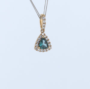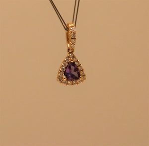 Exuding An Irresistible Natural Alexandrite, This 18Kt Yellow Gold Alexandrite Trillion Pendant Is A Visual Delight. A Halo Of Glistening Diamonds Outlines The Claw Prong Set Gem. The Diamond Studded Bale And The Scrollwork Detailing On The Sides Add To The Overall Beauty Of This Pear-Shaped Alexandrite Pendant. The Alexandrite's Color Change Is Described Bluish-Green In Daylight Changing To Purple In Incandescent Light, Alexandrite's Are Priced For Their Ability To Change Color Naturally. Crafted In 18Kt Yellow Gold The Trillion Alexandrite Weighs 0.20 Carat With 0.10 Carats Of Surrounding Round Diamonds That Are Graded As G-H Color With Vs Clarity.