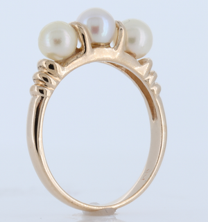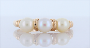 14K Yellow Gold Genuine Pearl Ring. Three Shiny Pearls Are Spaced With Vertical Gold Bars, Perfect Gift For An Infant.