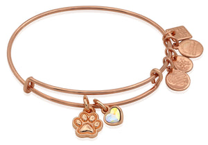 Honor your furry friend and share your love with the world with this Alex and Ani Paw Print Duo Charm Bangle Bracelet. Crafted in Shiny Rose Gold Finish this bangle boasts a paw print charm and a sparkling iridescent Swarovski crystal heart charm.