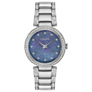 The Citizen Silhouette Crystal EM0840-59N is a sophisticated ladies' timepiece that blends elegance with cutting-edge technology. Powered by Citizen's Eco-Drive movement, it draws energy from any light source, ensuring it never requires a battery replacement. The watch features a stunning 28mm silver-tone stainless steel case with Swarovski® crystal accents on both the bezel and the bracelet, adding a touch of glamour. The beautiful blue mother-of-pearl dial complements the design, offering a refined and timeless appeal. Ideal for both business and leisure, this versatile timepiece will elevate any outfit.