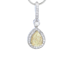 Every woman should have at least one breathtaking pendant in her jewelry wardrobe that she can wear on any occasion. This beautiful pendant will, no doubt, make you feel and look like a million dollars – go ahead, you deserve it! 1.04ct fancy yellow diamond center set in 14k gold with .40ctw diamond accents.