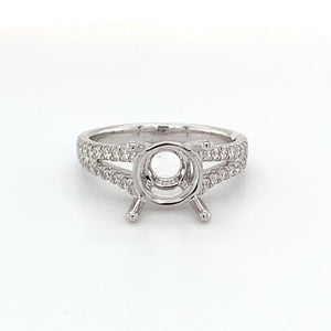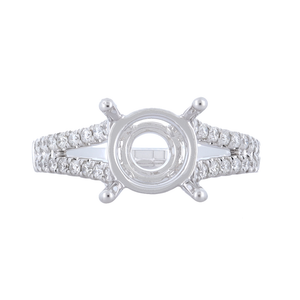 This Diamond Engagement Semi-Mount Ring Features Round Diamonds Set In A Split Shank In A French V Cut Pave Setting, With A Four Prong Round Basket Suitable For A 2-3 Carat Round Center Stone. Crafted In Fine 18K White Gold With F-G Color Diamonds And Vvs2-Vs1 Clarity.