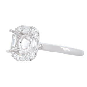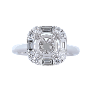 This Beautifully Crafted Semi-Mount Ring In 18K White Gold Features An Cushion Shape Diamond Halo Featuring A Mix Of Round And Baguette Cut Diamonds, The Center Is Suitable For A 2-2.5 Carat Round Or Square Center Stone. The Center Has Four Prong Basket (7.5Mm) To Bring Out The Center And The Ring Shank Is Rounded Comfort Fit. The Halo Diamonds Weigh A Total Of 0.99 Carats And Is F-G Color With Vvs-Vs Clarity Diamonds.