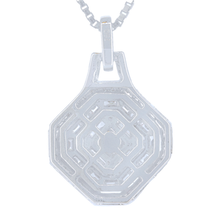 This Beautifully Hand Crafted Octagonal Shape Diamond Pendant Set In 18Kt White Gold Is A Combination Of Round And Tapered Cut Baguette Diamonds. It Has A Pave Set Of Diamonds On The Outside And On The Bail That Showcases A Continuos Flow Of Diamonds With A Row Of Tapered Cut Baguettes Followed By A Solitaire Look In The Center. Total Weight Of Diamonds 1.17Cts Graded As E-F Color With VVS2-VS1 Clarity.