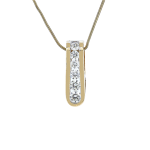 The 14Kt Yellow Gold Diamond Straight Bar Pendant is a timeless piece featuring 6 round brilliant cut diamonds in a classic channel setting. With its invisible bail and elegant design, it seamlessly pairs with wider necklaces or chains.