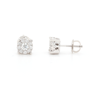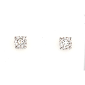 14Kt White Gold Diamond Earrings, Featuring 20 Individual Round Brilliant Cut Diamonds In A Prong Setting . The Prong Set Larger Central Diamond And Its Surrounding Diamonds Sparkle Away Brilliantly. These Stud Earrings Are Suitable To Be Worn With Any Attire And Give An Impression Of A Larger Single Stone Like Solitaire Diamond Studs With Classic Screw Backs For Maximum Security. Total Diamond Weight Is 0.58 Carat And Is Graded As G-H In Color With Si1-Si2 In Clarity.