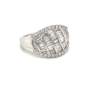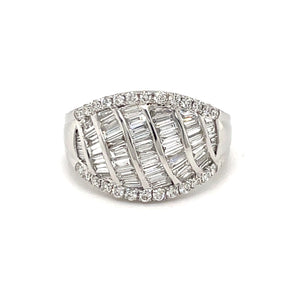 | Experience the epitome of sophistication with this stunning multistone ring, crafted in lustrous 14k white gold. This exquisite ring features 0.32cts of round cut diamonds and 0.92ct of meticulously set baguette cut diamonds, known for their linear facets and step cut, creating a sleek and modern aesthetic. Its design ensures a captivating play of light and brilliance, making it a luxurious addition to any jewelry collection. |