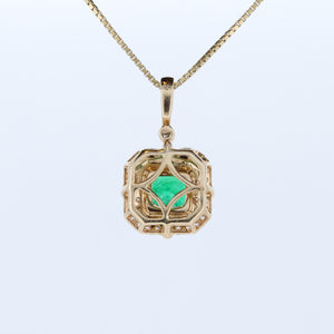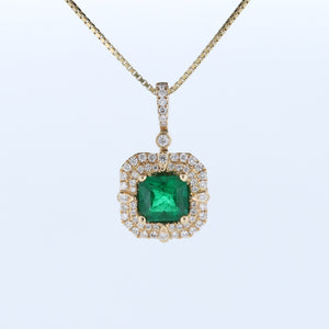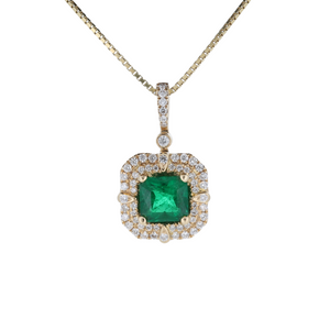 This Gorgeous Cushion Cut Natural Zambian Emerald Is Set In A Double Halo Of Illuminating Round Diamonds For A Larger More Stunning Look, Matching Diamond Accents Grace The Bale With One Larger Bezel Set Round Diamond Separating The Halo From The Bale. Crafted In 14Kt Yellow Gold, The Emerald Weighs 1.07 Carat, The Round Diamonds Weigh 0.32 Carats And Are G-H Color Within Vs1-Vs2 Clarity.