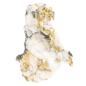 Natural Gold quartz specimen consisting of natural gold on top of white quartz. The gold is well crystalized and has an intricate form that extends from the matrix in all directions. Weight 18.04 grams.