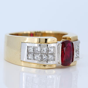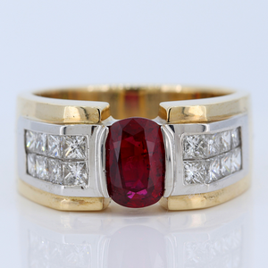 Mens 14k Two Tone Yellow and White Gold ring featuring an exquisite Ruby totaling 1.59ct. To add even more drama to this already handsome ring, there are 2 rows of square shaped diamonds on both sides of the Ruby set in white gold totaling 1.32ctw. All diamonds are graded SI1 and G/H in quality.