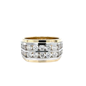 | This impressive multistone ring showcases a band of 3.12ct brilliant round cut diamonds set in lustrous 14k yellow and white gold. This meticulously crafted ring is a statement of refined elegance and superior craftsmanship, ideal for adding a touch of luxury to any occasion. |