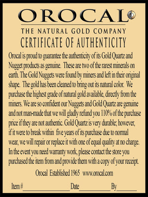 Authenticity: Some Stores sell man-made imitation gold quartz which is fragile and frail. This leads consumers to believe its natural when it clearly is not. When buying from me you know its authentic coming directly from Orocal the source. We offer a 110% money back Guarantee card which is called are certificate of Authenticity.
