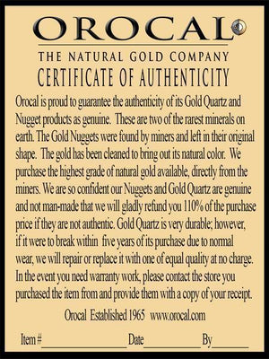 Authenticity: Some Stores sell man-made imitation gold quartz which is fragile and frail. This leads consumers to believe its natural when it clearly is not. When buying from me you know its authentic coming directly from Orocal the source. We offer a 110% money back Guarantee card which is called are certificate of Authenticity.