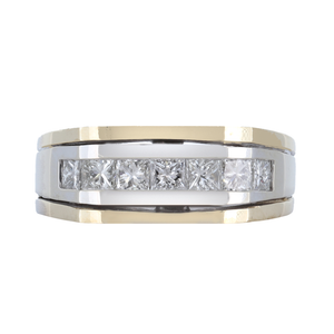 Seven Striking Princess Cut Diamonds Embellish This 14Kt Two Tone Gold Men's Diamond Channel Set Band, While The White Gold In The Center Creates A Fascinating Look With The Diamonds. The Ring Has A Total Diamond Weight Of 1.00 Carat With G-H Color And Vs2-Si1 Clarity Diamonds.