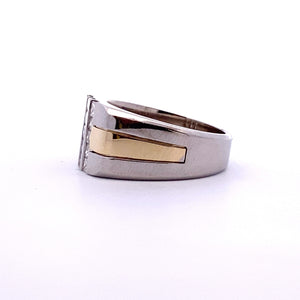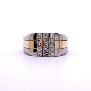 | Elevate your style with this sophisticated 14k two toned gold ring. The unique design showcases 1.08ct of square cut diamonds set for optimal brilliance. This band combines timeless elegance with contemporary flair. |