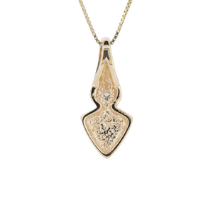 14KT Yellow Gold Natural Gold Quartz Pendant, Triangular shaped gold quartz gemstone, with a beautiful simple design of high polished yellow gold and a single round brilliant cut diamond bezeled on the high polish gold. The round brilliant cut diamond is 0.05 carat and is G in color and SI in clarity.