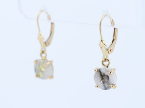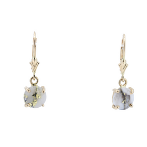 14kt Yellow Gold natural gold quartz earrings with 2 round shape gold quartz gemstones set in a 4 prong setting along with dangle lever backs for a secure yet comfortable feel.