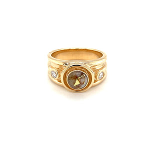 A 14Kt Yellow Gold And Diamond Ring With A Round Natural Gold Quartz With A Halo Of Natural Gold Nuggets. The Center Round Natural Gold Quartz Is Set In High Polished 14Kt Gold Bezel With A Channel Of Natural Gold Nuggets. On Each Side Of The Center Stone Is One .10Ct Round Brilliant Cut Diamond In A Raised Bezel For A Total Of .20Cts Of Diamonds. The Band Of The Ring Has Two Recessed Channels, Creating A Raised Ridge Running From The Center Stone Around The Full Band.