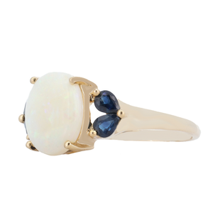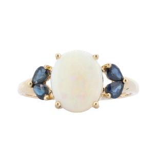 Add This Bright Ring To Complete Your Look! It Showcases A 12X10Mm Oval Opal Cabachon, Graced With Four Tear Drop Shaped Sapphires Weighing 0.40 Carat. It Is Crafted In 14K Yellow Gold.