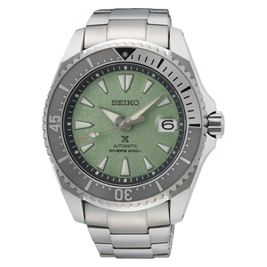 The Seiko Prospex Sea SPB349 is a U.S. Special Edition diver’s watch, blending robust functionality with captivating design. It showcases a textured light green dial inspired by the changing tones of mineral deposits in underwater caves. The uni-directional rotating bezel complements the dial with a subtle two-tone design, symbolizing the duality of light and dark within deep waters.