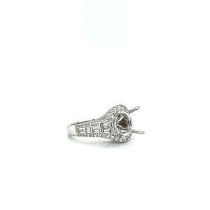 Spectacular Diamond Semi-Mount Setting Surrounded With Illuminating Round Diamonds Working Its Way Up to A Halo With Four Individual Channels Of Tapered Step Baguette Diamonds And A Four Prong Head Suitable For A 2-3 Carat Center Stone, Adding To A Stunning More Larger Look For The Center Stone, Crafted In Lustrous 18Kt White Gold. The Total Diamond Carat Weigh Is 1.17 Carat Of F-G Color Diamonds With Vvs2-Vs1 Clarity Diamonds.