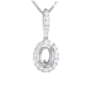 Absolutely Stunning, This Diamond Semi-Mount Pendant Will Be The Perfect Frame To Showcase A Treasured Diamond Or Gemstone Of Your Choice. The Halo-Style Piece Is Composed Of Glistening 14K White Gold And Is Graced By Sparkling White Diamonds That Will Beautifully Compliment A Wide Variety Of Oval Shaped Solitaires. 0.25 Carats Of F-G Color Diamonds With Vs Clarity