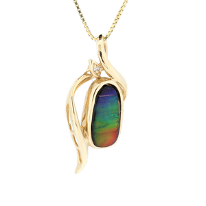 14Kt Yellow Gold Ammolite Free Form Shaped Pendant Set In A Classic Bezel, With A Fancy Framework And A Single Round Brilliant Cut Diamond Built In Its Frame-Work Set In High Polish Gold, Matching Bail In High Polish Gold. The Ammolite Gemstone Is Graded as AA With 3 Or More Bright Colors, With The Presence Of Fine Matrix Lines.