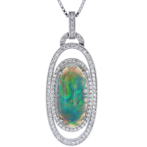 No two Opals are alike. You can express your uniqueness with this stunningly beautiful 8.68ct Opal pendant. Set into 14k white gold and featuring a phenomenal 1.55ctw double diamond halo.