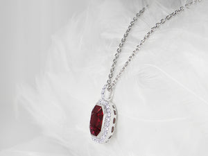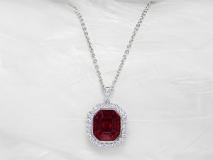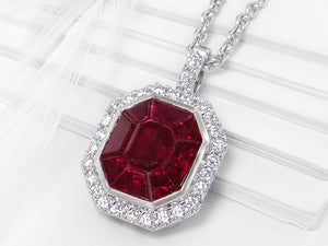 Only For Her, This Gorgeous Ruby Diamond Pendant Featuring An Octagon Cut Ruby Which Is Surrounded With Step Cut Rubies In An Invisible Setting Followed By Round Brilliant Cut Prong Set Diamonds To Enhance The Look Of The Center Rubies. There Are Round Diamonds Shared In A 4 Prong Setting On The Bail To Give A Look Of Continuos Flow Of The Diamonds. Rubies Total Weight 2.45Cts, Diamonds .27Cts Graded As G-H Color, Clarity Vs2-Vs1.