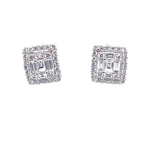 | Elevate your ensemble with these exquisite stud earrings. Crafted in lustrous 14k white gold, they feature a square silhouette, adorned with 0.58ct of baguette cut diamonds and 0.48ct of round diamonds. The diamonds boast excellent cut, polish and symmetry. These brilliant earrings are a timeless addition to any jewelry collection. |