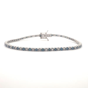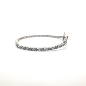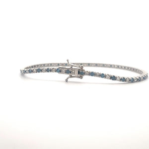 | Exquisite tennis bracelet meticulously crafted in gleaming 14k white gold, showcasing 1.26ct of fancy blue diamonds and 1.11ct of white diamonds. This stunning piece epitomizes timeless elegance, perfect for adding a touch of sophistication to any ensemble. |