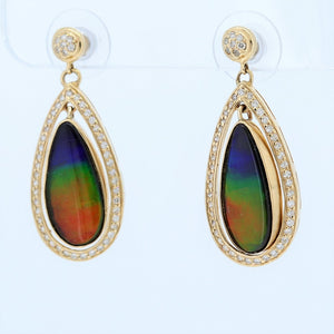 14Kt Yellow Gold Ammolite And Diamond Earrings, 2 Tear Dop Shaped Ammolite Gemstones Set In A Customized Bezel And Surrounded By Round Brilliant Cut Diamonds In A Micro Pave Setting, The Posts Contain A Cluster Of Round Diamonds Matching The Diamond Halo, The Ammolite Gemstones Dangle From The Diamond Halo For Maximum Light Intake. The Ammolite Is Graded as AAA (Highest Quality) As It Contains 3 Or More Distinct Vibrant Colors From Any Angle. The Diamonds Are Graded As G-H In Color And Are Vs2-Si1 In Clarity For A Total Of 0.85 Carat.