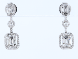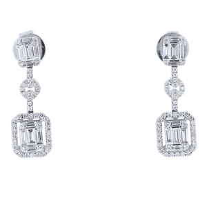 These Gorgeous Drop Earrings Are Designed In 18Kt White Gold And Exude An Opulent Charm.Center Diamonds Are Step Cut Diamonds Which Are Surrounded By Round Brilliant Cut Diamonds And The Post Features With 5 Tappered Cut Diamonds That Has 4 Round Diamonds On The Corners.The Link That Holds Between The Post And The Dangle Is A Unique Vivid Design With Round Diamonds.The Diamonds Are Graded As E-F Color And The Clarity Is VVS2-VS1.