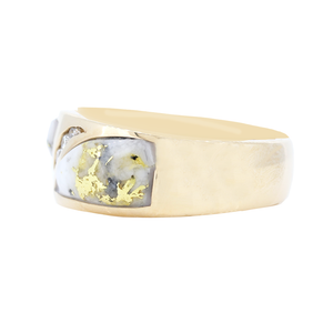 14KT Yellow Gold Women's Natural Gold Quartz and Diamond Ring, featuring two gold quartz gemstones that are set in a special inlay setting, The gold quartz gemstones are meticulously sculpted by hand to fit perfectly into its custom created channel and then thoroughly hand-polished to a seamless finish, the solid inlay creates a gemstone that rises above the gold setting forming a dome. Distinct gold patterns exist throughout both the gemstones over pure white quartz displaying a contrast like none other. The ring is finished in high polish yellow gold, There are 5 round brilliant cut diamonds that separate the 2 inlay gold quartz gemstones. The total carat weight of the diamonds is 0.10 carat. They are graded as G in color and SI in clarity.