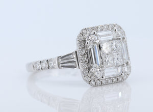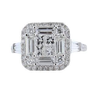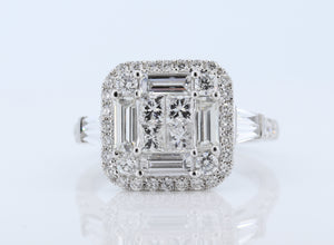 18Kt White Gold Ladies' Diamond Cluster Ring, Featuring 4 Princess Cut Diamond Center Stones In An Invisible Setting. Surrounding The Princess Cut Diamonds Are 4 Large Step Cut Diamonds, And 4 Round Brilliant Cut Diamonds, For A Solitaire Diamond Look. A Halo Of 28 Smaller Round Brilliant Cut Diamonds In A Shared Prong Setting Surround The Solitaire Look, The Side Profile Contains On Each Side 3 Round Brilliant Diamonds Along With Tapered Step Cut Baguette Diamonds. Total Diamond Piece Count Of 50 Diamonds Makes This Piece A Stunning Beauty. Total Carat Weight Of Diamonds Is 2.25 Carat And Are Graded As E-F Color Vs1-Vs2 In Clarity.