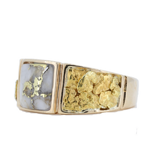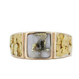 14KT Yellow Gold Women's Natural Gold Quartz and Natural Gold Nugget ring, consisting of one square shaped gold quartz gemstone, that is inlayed to perfection. The gold quartz gemstone is meticulously sculpted by hand to fit perfectly into its custom created bezel and then thoroughly hand-polished to a seamless finish, the solid inlay creates a gemstone that rises above the gold setting forming a dome. Distinct gold patterns exist throughout the gemstone over pure white quartz display a contrast like none other. The gold quartz gemstone measures 9mm in length and width, it is finished in high polish yellow gold, also inlayed on both sides of the gold quartz gemstone are several natural gold nuggets in a customized channel, this bold vibrant ring is a true "Alaskan" keepsake.