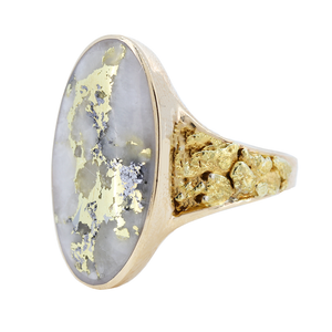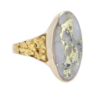 14KT Yellow Gold Women's Natural Gold Quartz and Natural Gold Nugget ring, consisting of one elongated oval shaped gold quartz gemstone, that is inlayed to perfection. The gold quartz gemstone is meticulously sculpted by hand to fit perfectly into its custom created bezel and then thoroughly hand-polished to a seamless finish, the solid inlay creates a gemstone that rises above the gold setting forming a dome. Distinct gold patterns exist throughout the gemstone over pure white quartz display a contrast like none other. The gold quartz gemstone measures 23.5mm in length 13.5mm in width, it is finished in high polish yellow gold, also inlayed on both sides of the gold quartz gemstone are several natural gold nuggets in a customized channel, graduating from broad to narrow to naturally form to the width of the shank this bold vibrant ring is a true "Alaskan" keepsake showcasing two amazing stones in one great collection.