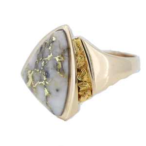 14KT Yellow Gold Women's Natural Gold Quartz and Natural Gold Nugget ring, consisting of one triangle shaped gold quartz gemstone, that is inlayed to perfection. The gold quartz gemstone is meticulously sculpted by hand to fit perfectly into its custom created bezel and then thoroughly hand-polished to a seamless finish, the solid inlay creates a gemstone that rises above the gold setting forming a dome. Distinct vibrant gold patterns exist throughout the gemstone over pure white quartz display a contrast like none other. The gold quartz gemstone measures 15.40mm in length 10.25mm in width, it is finished in high polish yellow gold, also inlayed on one side of the gold quartz gemstone are several natural gold nuggets in a customized channel, graduating from broad to narrow to naturally form to the width of the shank this vibrant ring is a true "Alaskan" keepsake showcasing two amazing stones in one great collection.