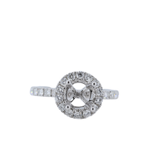 14Kt White Gold Diamond Semi-Mount Featuring A Classic Halo Setting, With 14 Individual 4 Prong Set Round-Brilliant Cut Diamonds In A Halo, On Either Side Of The Halo Are A Total 10 Diamonds Graduating As Design Permits. The Semi Mount Features An In-Built 4 Prong Head Suitable For A 1.00-1.50 Carat Round Center Diamond. Halo Settings Accentuate The Look Of The Center Creating A Larger Stunning Look. The Total Carat Weight For The Semi-Mount Is 0.64 Carat. The Diamonds Are Graded As G-H In Color With Si1-Si2 In Clarity