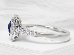 Hand Crafted With Bright Blue Natural Sapphires Complimented With Round Near Colorless Diamonds Of G-H Color,VS1-VS2 Clarity In A Halo Fashion Which Very Gracefully Rest On 18Kt Luscious White Gold And Has A Touch Of High Polish Making It Look Very Elegant. To Make It Look More Elegant The Jeweler Decided To Pave Set Round Diamonds On The Band On Each Side Of The Ring. Sapphires Total Weight 1.45Cts, Diamonds .36Cts