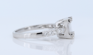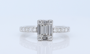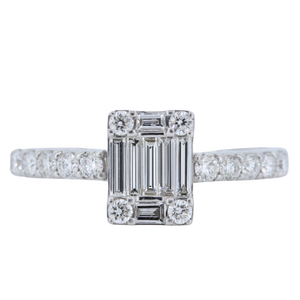 Simple But Still Elegant, This Beautiful Ring Features .54Cts Total Weight Round And Baguette Cut Diamond In Invisible Setting Showcasing A Solitaire Look In 18Kt White Gold. Diamonds Are Graded Color E-F, Clarity VVS2-VS1.