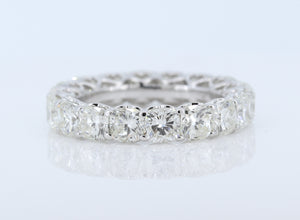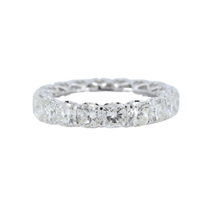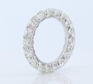 18Kt White Gold Diamond Eternity Band, Exquisite Piece Featuring 18 Cushion Brilliant Diamonds Matched To Perfection, Each Stone Measures 4.1Mm And Features Heart Shaped Gallery Work Along The Sides, It Has A Solid White Gold Band On The Inside For Additional Comfort. Total Of 4.50 Carats Of Diamonds And Is Graded As G In Color And Vs1-Vs2 In Clarity.