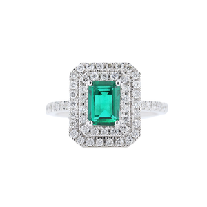18k White Gold ring featuring an exquisite .90ct Emerald. To add even more beauty to the ring, there are 2 rows of diamonds in a halo as well as running down the band totaling .56ctw. All diamonds are graded SI1 and G/H in quality.