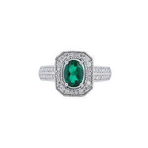 This Stunning Oval Emerald And Halo Diamond Engagement Ring Features A Hand Picked Natural Oval Cut 0.70 Carat Emerald. It Is Surrounded By A Halo Of 0.29 Carat Of Sparkling Round Brilliant Cut Diamonds That Are F-G Color With Vs Clarity Set On A Solitaire Band Crafted In 14Kt White Gold.