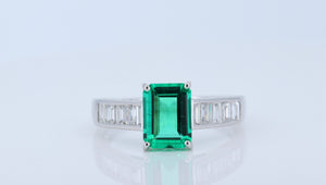 Modern Design Engament Ring featuring 1.20 Ct Emerald center surrounded by 0.66 Baguette Diamonds on both sides in 14KT White Gold