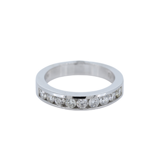14Kt White Gold Ladies Channel Set Diamond Band, Featuring 9 Round Brilliant Cut Diamonds In A Classic Channel Setting, For A Smooth Seamless Feel To The Swipe Of A Finger And Embraced With High Polish White Gold. The Diamonds Weigh 0.75 Carat And Are G-H In Color With Si1-Si2 In Clarity. A Daily Wearer With Low Maintenance, Sure To Impress.