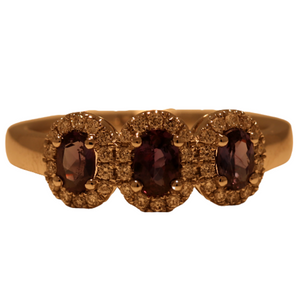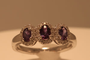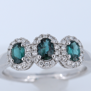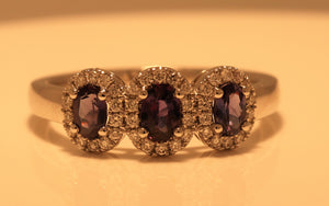 18k White Gold ring featuring 3 exquisite oval Alexandite totaling .63ct. To add even more drama to this already beautiful ring, there are diamonds surrounding each Alexandrite totaling .19ctw. All diamonds are graded SI1 and G/H in quality. Alexandrite is categorized as a phenomenal gemstone as it changes color naturally from a mossy green to a cabernat red when it hits natural sunlight.