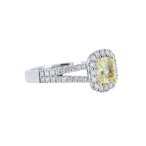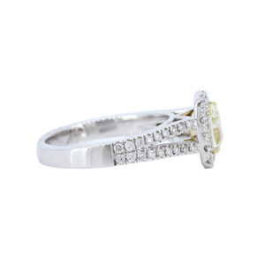 This 18K white gold ring features a 1.01-carat radiant color-enhanced yellow diamond at its center, surrounded by 0.39 carats of VS1 round diamonds in a prong-set halo style. The ring comes with a GAI certificate.