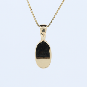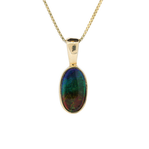 14Kt Yellow Gold Oval Shaped Ammolite Pendant Set In A Classic Bezel, With A Frame Of High Polish Gold, Matching Bail In High Polish Gold Makes This A Classic Everyday Piece. The Ammolite Gemstone Is Graded as AA With 3 Or More Bright Colors, With The Presence Of Fine Matrix Lines.